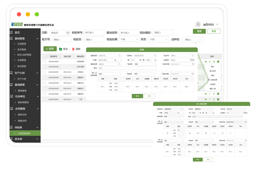 1、包括亲本检验入库、亲本发放关联制种合同、退货调货、调拨、精选、盘点等功能模块
