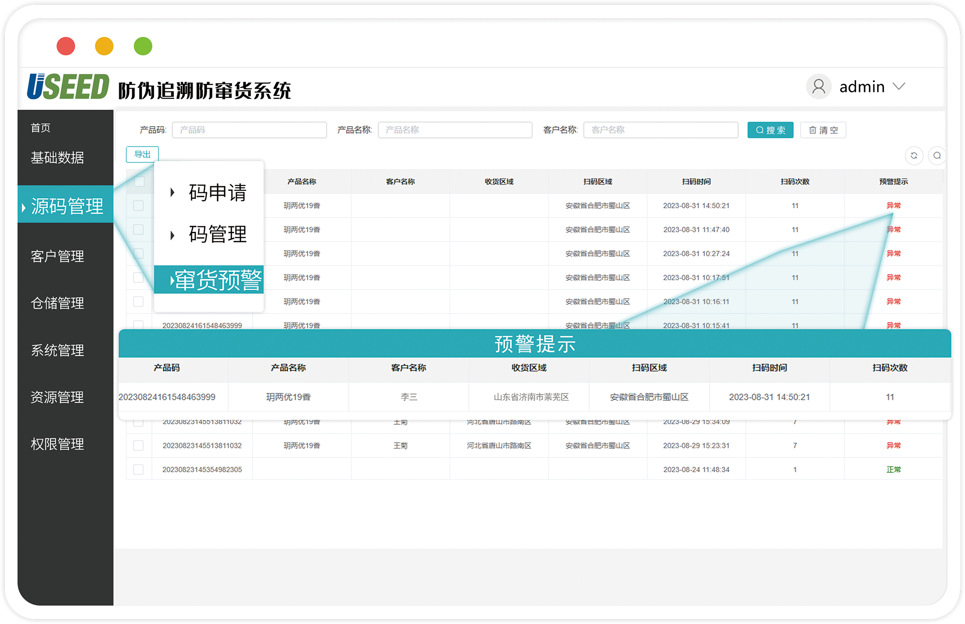 在安徽联智创新软件有限公司,智慧种业全产业链溯源系统平台中,系统记录下每一件产品的流通路径,稽查人员扫码稽查时可实时定位稽查地理位置并获取产品流通路径,系统根据经销范围比对生成稽查结果,与此同时,消费者扫码查询真伪时,系统可以自动获取扫码位置,并与记录的产品归属区域进行匹配,若出现异常则自动生成窜货预警信息提醒稽查人员。